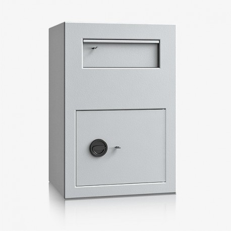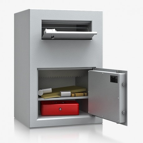 Model z wrzutnią na górze sejfu, otwieraną do dołu z blachą odprowadzającą. Wrzutnia zamykana certyfikowanym zamkiem kluczowym. Maksymalne wymiary depozytu W*S*G 280*400*20 mm
