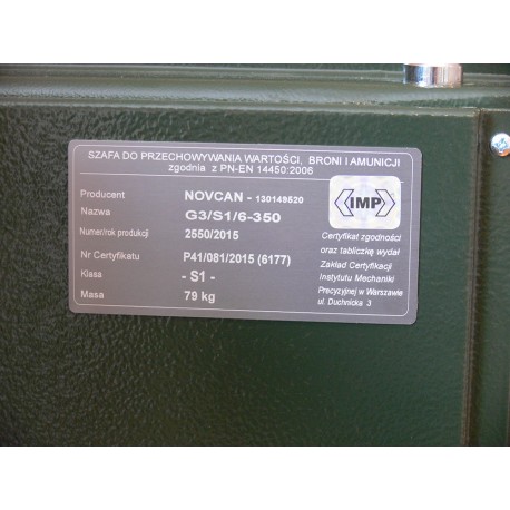 Novcan Szafa na broń długą G3/S1/6-350 Jednopłaszczowa profilowana konstrukcja korpusu oraz dwupłaszczowa konstrukcja drzwi umożliwia bezpieczny sposób przechowywania broni palnej i amunicji.