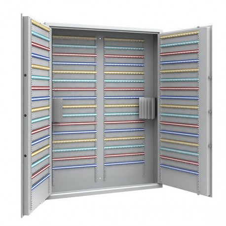 • Drzwi dwuściankowe o łącznej grubości 50 mm, trójstronnie ryglowane, zamykane zamkiem kluczowym VdS – Klasa I / IMP – Klasa A. (standardowo z dwoma kluczami)