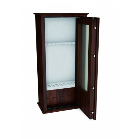 Szafa MLB w wersji Lux, charakteryzuje się przeszklonymi drzwiami z szybą kuloodporną i antywłamaniową oraz ekskluzywną zabudową wewnątrz. Oferujemy 2 warianty z zabudową drewnianą z zewnątrz lub powłoką lakierniczą na wysoki połysk. Produkt możemy dopasować do potrzeb klienta.