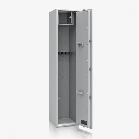 CECHA SZCZEGÓLNA - szafa standardowo wyposażona w skrytkę o wys. 200 mm (zawieszaną, z możliwością łatwego demontażu) na górze sejfu oraz uchwyt na wyciory na wewnętrznej osłonie drzwi. Na ścianie tylnej sejfu perforacja pozwalająca na zmianę umiejscowienia uchwytów na broń.