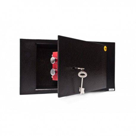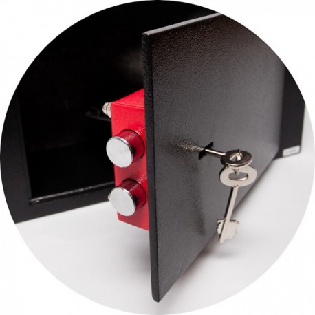 - Mechanizmem zamykającym sejf podłogowy jest dwu - ryglowy zamek ( rygle 22 mm), który odblokowywany jest za pomocą klucza,