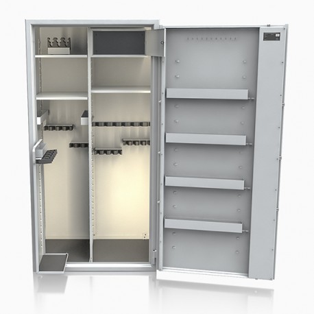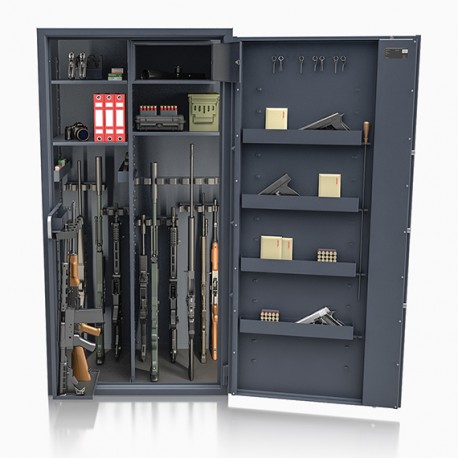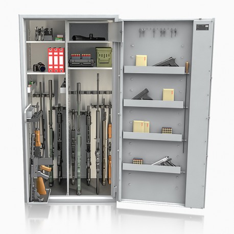 Poprzez możliwość przestawiania na wysokości półek jak i uchwytów na broń – można dowolnie spersonalizować wnętrze umożliwiając dogodne ustawienie broni o różnej wysokości.