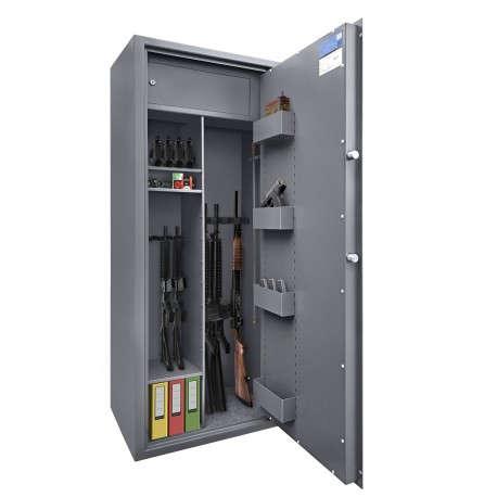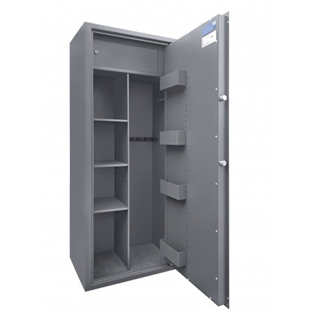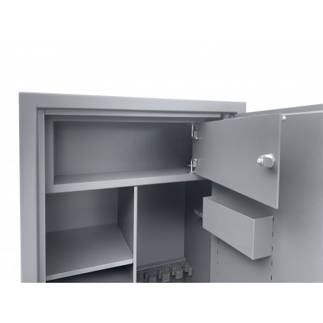 - Skrytka zamykana na klucz - skrytka nie jest wykonana do końca głębokości szafy, w szafie jest miejsce na broń długą o wysokości do 144 cm. na całej szerokości szafy.